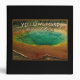 The Morning Glory pool in Yellowstone National Park on a vintage travel design.
