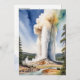 This postcard features a watercolor of Old Faithful geyser in Yellowstone National Park.