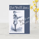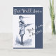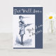 Get well soon card with a silly vintage illustration of a stork in mens clothing and top hat with syringe."Yes, I Am A Doctor" half way down and "Get well soon" at top. White and blue colors.