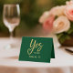 This elegant emerald green and gold wedding design features the phrase “Yes we do!” with the word “Yes” written in a romantic gold script — the sweeping Y cleverly incorporates a heart shape, symbolizing love and unity. The minimal chic layout combines bold modern typography with timeless gold accents, creating a luxurious look perfect for formal events, emerald green tie celebrations, or evening weddings. The names are displayed in graceful calligraphy, adding a touch of personal charm to this sophisticated stationery.