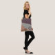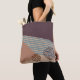 This tote bag has a mod-century modern abstract design made of blue line, a tan triangle, and a brown circle made of dots on a field of dark eggplant and cream. If you want the same design with different colors, message me.