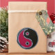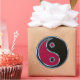 Round sticker with a red and black yin and yang symbol.