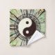 A dazzling trippy prism like pattern of greens and browns showcasing the ancient harmonizing yin yang symbol with a decorative Greek stencil border. Zen boho spiritual vibes