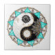 Mandala design based on the Chinese philosophy of opposing forces yin and yang. The two forces are surrounded by a white, gold, and silver mandala design and adorned with an eye, feathers, and a gold and silver flower design.