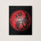 This beautiful yin yang design features two stylized tribal roses. Intricate black and red swirls decorate both sides of this traditional symbol creating a delicate pattern. The two flowers flow from the bottom of the teardrop on either side with leaves growing from the stems. This unique yin yang makes a stunning and stylish puzzle design.