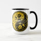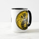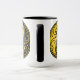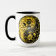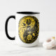 This beautiful yin yang design features two stylized tribal roses. Intricate yellow and black swirls decorate both sides of this traditional symbol creating a delicate pattern. The two flowers flow from the bottom of the teardrop on either side with leaves growing from the stems. This unique yin yang makes a stunning and stylish mug design.