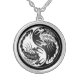 This black and white yin yang design features two stylized scorpions. Each arachnid curves around the edge of the tear drop with it's stinger curling back towards the body. The scorpions pincers are held just above the head and it's legs are stretched out in an aggressive pose. This stylish pattern is a stunning example of this traditional symbol for the balance of nature.