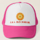 Kid`s Trucker Hat pink with white front red and gold circle with smiling sunshine (with slightly darker face) in the center and "MAXANNA GLOW A.K.A. SUZY SUNSHINE". This design is all about fun. Smile and the whole world smiles with you.