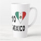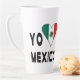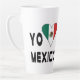Large latte mug uses a heart shaped Mexican flag instead of the word LOVE, or AMO. Design reads YO AMO MEXICO, or I LOVE MEXICO, on two sides. The flag is green, white, and red with an eagle in the center. Fun on Cinco de Mayo. Great housewarming gift.