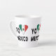 Small latte mug uses a heart shaped Mexican flag instead of the word LOVE, or AMO. Design reads YO AMO MEXICO, or I LOVE MEXICO, and shows on three sides. The flag is green, white, and red with an eagle in the center. Fun on Cinco de Mayo. Great housewarming gift.