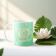 Yoga Studio Meditation Instructor / Life Coach / Healer / Reiki Master / Massage Therapy Mugs Templates - Elegant Calligraphy Faux Gold Foil Yoga Meditation Easy Pose / Sukhasana Pose with ZEN Symbol and OM Symbol on Green Gold Foil Texture Background.