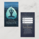Yoga Fitness Studio / Meditation Instructor / Personal Trainer / Life Coach / Healer / Reiki Master / Massage Therapy Appointment Business Card Template - Modern Faux Light Teal Blue Green Gold Foil Bodhi Leaf Cutting as Yogi in Easy Seat pose / YOGA Easy Pose / Sukhasana Pose on Dark Blue Wave Pattern Grunge Background.