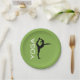 Paper plates with a simple design of a black silhouette of a woman performing a yoga pose. Set on a green background with yoga written in white.