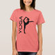 A t-shirt with a simple design of a black silhouette of a woman performing a yoga pose. Leg raised up and arms outstretched. Holistic design.