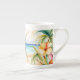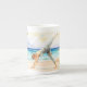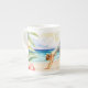 A serene watercolor design featuring a woman in a yoga Namaste pose by the ocean at sunrise, printed on a fine Bone China mug. The calm beach view, soft pastel tones, and graceful silhouette create a peaceful start to any morning. Perfect for those who love yoga, mindfulness, or a touch of coastal calm in their daily routine.