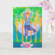 A pretty Happy Birthday greeting card featuring a peaceful woman in a tree pose yoga posture with a bright pink lotus flower in a pond, trees and big purple full moon painted with watercolor. You can edit the text to fit your needs.