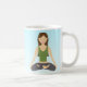 Stylish vector illustration of a beautiful brunette woman doing yoga. The woman is sitting in traditional lotus position. She is wearing a green tank top and dark grey pants. The background is a lovely blue gradient.