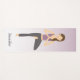 This yoga mat features Destei's illustration of a beautiful brunette girl practicing yoga. The woman is doing the tree pose and her hands are in namaste. She is wearing a lilac shirt and dark grey pants. There is also a personalizable text area for a name in gray color font. The background is a lilac to white gradient.