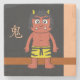 This stone coaster features a chibi, cartoon drawing of a red oni. The oni (鬼) is the Japanese equivalent of an ogre. They are often depicted with red skin and horns, wearing a tiger-print loincloth and carrying a spiked club. The monster's name, in Japanese kanji, appears in the top left.