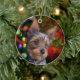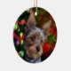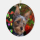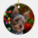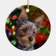 Young Yorkshire Terrier, or Yorkie, with holiday colors and a Christmas tree in the background dog lovers Christmas holiday ornament