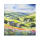 "Yorkshire Meadowsong". Landscape Yorkshire Dales. This stylized watercolour illustration of the Yorkshire Dales exudes tranquillity, with rolling hills and fields bordered by stone walls. Stone houses nestle the landscape, and vibrant meadow flowers provide a colourful contrast, embodying the peaceful, relaxed spirit of the countryside.