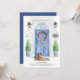 Announce your new address with our stylish announcement featuring a Yorkshire Terrier, blue front door, welcome mat, slate sign, topiaries and a floral wreath set on a gray brick background.