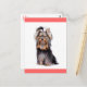 Aww...who can resist the sweet face of a Yorkshire Terrier puppy dog? This fun greeting postcard features a Yorkie pup sitting on a crisp white background with a pretty pink border. She is quite the little diva with a tiny ponytail in her hair and is ready to help you send greetings to family and friends.