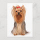 This fun canine post card features a Yorkshire Terrier puppy dog with a red ribbon in her hair sitting on a crisp white background.