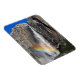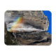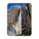 This photo features winter at Yosemite Falls with snow and rainbow on a sunny day.