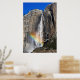 This photo features winter at Yosemite Falls with snow and rainbow on a sunny day.
