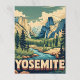 A retro-style travel poster illustrates the stunning Yosemite Valley, featuring towering granite cliffs like El Capitan and Half Dome, a winding river, and lush pine forests under a dramatic sky. "YOSEMITE" is boldly displayed at the bottom.