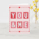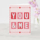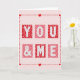 This Valentine’s Day greeting card features a soft pale pink background with a tidy grid of six square tiles centered on the front. Each square holds a large white letter that together spells out “YOU & ME.” The letters are outlined in red and filled with tiny uneven red dots, giving them a sweet, candy-like look. The tiles alternate between deep red squares decorated with small light pink hearts and coral pink squares with red polka dots, creating a warm and romantic pattern. A red dashed border frames the grid, with small red hearts placed along the line and at the corners. The bold block lettering makes the message stand out clearly. With its loving colors and thoughtful details, this card is a lovely choice for sharing affection with a partner or close friend on Valentine’s Day.