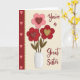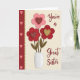 This card shows a simple bouquet of three flowers sitting in a white vase on a soft cream background. One flower is light pink and sits above two deep red flowers, and each flower has a heart-shaped center with a crisscross pattern. Two of the hearts are red with tiny light accents, while the top heart is gold, which makes it stand out. Along the left edge, there’s a narrow red strip filled with small pink hearts, bordered by a scalloped gold trim. The colors—red, pink, gold, and cream—give the whole scene a gentle, affectionate feel that fits Valentine’s Day ❤️. Near the bottom, the words “You’re a Great Sister” appear in reddish-brown letters with a slight shadow, making the text easy to notice without taking over the design. It feels meaningful because it’s both sweet and specific, like a small way to say “I see you and I appreciate you” 🥰.