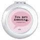 This silver-tone compact mirror features a single, bold, self-affirming phrase. Every glance reflects the truth — You are amazing. [Remember that.]