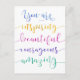 Cheer someone you know with colorful calligraphy compliments! Beautiful watercolor styled calligraphy design features this message: "You are inspiring, beautiful, courageous and amazing", in blue, gold, pink, purple, and green.
