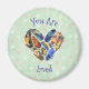 A magnt with a sweet expression. Text says you are loved. With a watercolor design of feathers in a heart shape. Set on a vintage style mint green background with faded pink and white polka dots.