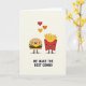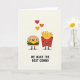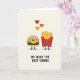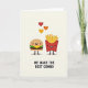 This Valentine’s Day card shows a smiling hamburger and a carton of fries enjoying a happy moment together on a soft cream-colored background. Both characters have round faces, dot eyes, pink cheeks, and wide smiles that show warmth and joy. Above them, three hearts shift in color from deep red to orange and yellow, suggesting growing affection. The burger is detailed with green lettuce, melted yellow cheese, and a brown patty, while the fries sit in a bright red box filled with golden fries. Bold black text at the bottom reads, “WE MAKE THE BEST COMBO,” tying the scene together as a fun celebration of love, friendship, and togetherness