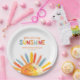 Cute sunshine baby shower paper plates featuring a playful and colourful sun, and a text template for you to customize.