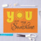 You are my sunshine text design with yellow, shiny sun decoration. It is possible to change the background color and to add different one to the design with your choice.