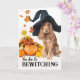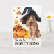 A golden tan colored Cocker Spaniel with a large witch's hat is sitting next to a pile of autumn leaves and various gourds and pumpkins on the cover of this Halloween, Howl-o-ween card. You are So Bewitching text on the cover. Customize the cover and inside text as you like. Art, image, and verse copyright © Shoaff Ballanger Studios, 2023.