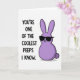 This greeting card splits the space between message and illustration, keeping the layout simple and easy to read. On the right, a rounded purple bunny-like character 🐰 stands on a white background, outlined with thick black lines that define its long ears and small puff tail. It wears dark rectangular sunglasses, and the tiny curved mouth suggests a flirty, knowing smile, like it’s sharing a private joke with someone it likes. On the left, a short compliment is set in a friendly sans-serif font, stacked in a few lines for quick reading. The lettering is black and sits centered in the left half, leaving comfortable white space around it. The joke in the wording lightly echoes the bunny’s candy-like shape, giving the whole card a cozy, affectionate tone without needing extra decoration 🌷. The strongest contrast comes from the purple figure against the white field, with the sunglasses and outline adding sharp black accents. The sunglasses are a solid near-black rectangle with a thin bridge, positioned just below the base of the ears.