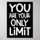 Positive vibes in bold white typography to display in your workspace for daily inspiration, with the words You Are Your Only Limit on a black background. The background color can be changed to another color if you wish via the Click to Customise Further Option.