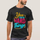 My 11 yo wore adult XL (5’7” 165#). The 8yo is small framed. She wore adult small and tied it in the back. Grandma wore adult large with long sleeve shirt underneath. Tall girl adult medium. Dark haired male adult large. Good quality dark Heather gray, Gildan brand shirt. -it was next up from basic choice and cost about $20 per shirt. Not too thick or thin. Washed and dried well, no major shrinkage. Not see-through. Can wear a bra under it fine. Screen print is just as shown and well done, front and back.