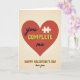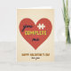 This card shows a big red heart in the center on a soft beige background, giving it a warm, cozy look. In the top right of the heart, there’s a puzzle-piece-shaped cutout that makes the heart look like it’s missing a small piece. Across the heart, the text reads “you COMPLETE me,” with “you” and “me” in dark blue, smooth cursive-style writing. The word “COMPLETE” stands out in yellow, simple all-caps letters, and it lines up with the missing piece idea like it’s filling in what’s needed. Below the heart, there’s smaller brown text that says “Happy Valentine’s Day,” also in cursive-style writing. The colors feel friendly and romantic, and the design keeps the focus on the idea of two people fitting together. It’s a sweet way to say you feel closer and more whole with someone you care about 💘❤️.