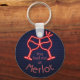 Round button keychain features fun text "You Had Me at Merlot" and two neon wine glasses on a midnight blue brick background. Keychains make memorable gifts for family and friends or create for yourself. Change to your favorite wine.