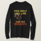 I love this shirt. I had written to the artist asking her if this picture was available on a shirt, and she wrote me back telling me where I could find the shirt. These shirts can be custom made to have a different saying. I loved this saying and went with it. The artist wrote me back later to tell me that she had seen my order go through. How's that for service? Pretty special. It's just as displayed. Perfect!
