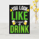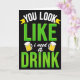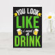 This card features a jet-black background with the phrase “YOU LOOK like i need a DRINK” arranged in stacked lines, giving the message a flirty, teasing rhythm between friends. “YOU LOOK” sits near the top in white, set at a slight angle, with small yellow arrow shapes pointing inward on both ends. The words “LIKE” and “DRINK” take over the center and lower area in bright lime green with shaded highlights that make the letters look raised. Between those two green words, “i need a” appears in smaller white cursive-style lettering, tucked neatly into the gap like a quick aside. On either side of that smaller line are two yellow beer mugs with white foam spilling up, like they’re clinking in a shared joke ☘️. The tight spacing and strong contrast keep everything easy to read while still feeling a little daring and affectionate, like a grin across the table. The foam tops and mug handles are outlined clearly in white and pale yellow, standing out against the dark background 💚.