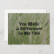 Say "thank you" to your classroom teachers, tutors, mentors, or anyone who has made a difference in your life. The background of this appreciation postcard features tall desert grasses with green stalks and white feathery tops. This beautiful nature photo provides vertical lines that provide the background for "You Made A Difference In My Life" which can quickly be personalized. This postcard offers an inexpensive option for graduates, employees, or anyone moving on to another chapter in their life and want to express their appreciation to those who help them along the way.