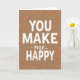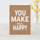 This card shares a simple, heartfelt message with a warm and cheerful design. In the center, bold white letters read “YOU MAKE me HAPPY.” The words “YOU MAKE” and “HAPPY” are strong and easy to read, while “me” is written in a flowing script that adds a personal, gentle touch.