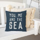 Add cool nautical style to your patio, beach house or pool area with our outdoor throw pillow in rich navy blue, featuring the quote "you, me and the sea" in off white lettering.